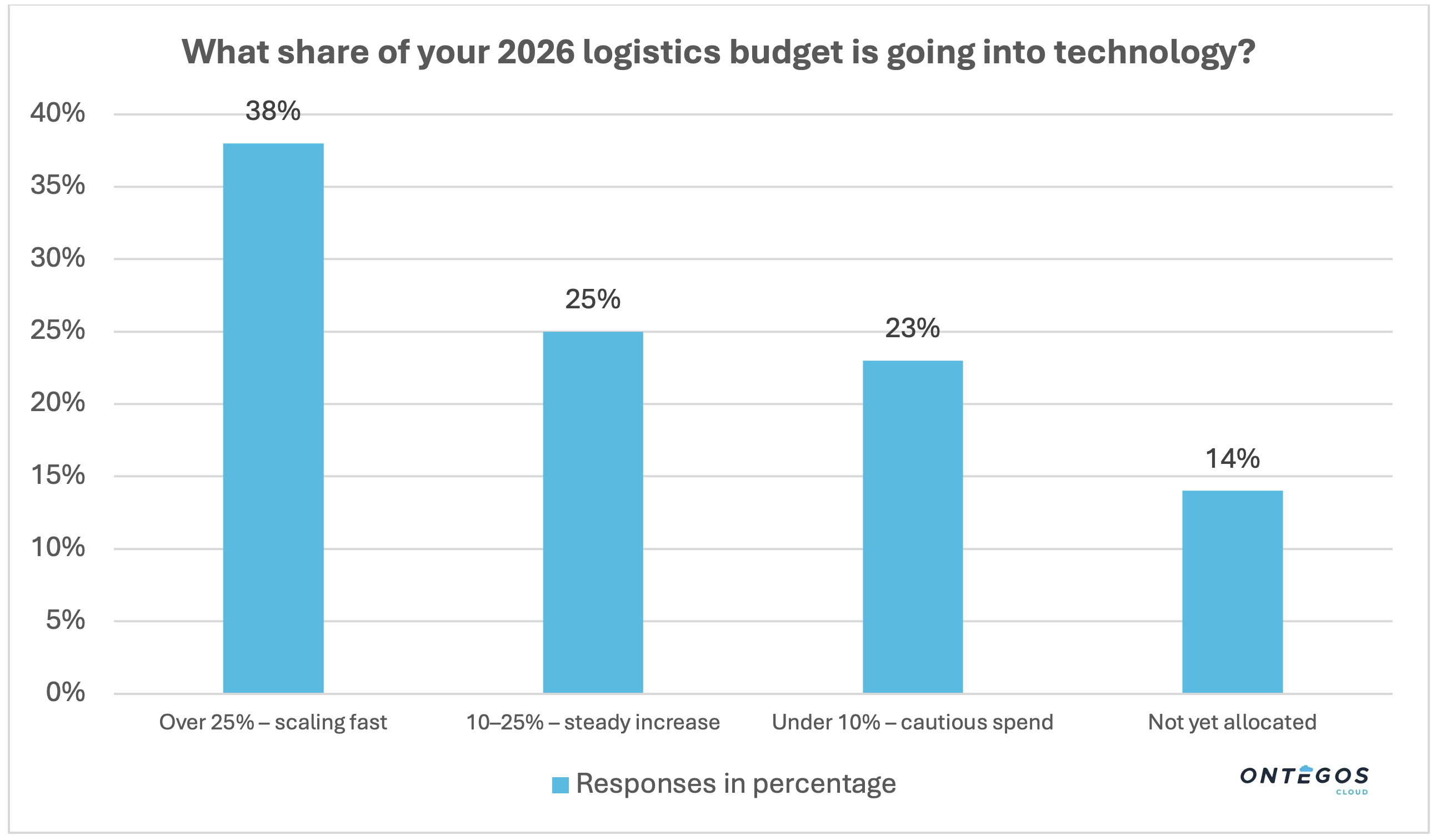 38% of freight forwarders and 3PLs report that over 25% of their 2026 budgets are going into technology, a significant sign of accelerating digital adoption. Another 25% are planning moderate increases (10–25%), while only 23% remain cautious with limited allocations under 10%. Just 14% have yet to define their technology budgets for next year. Just 14% have yet to define their technology budgets for next year.