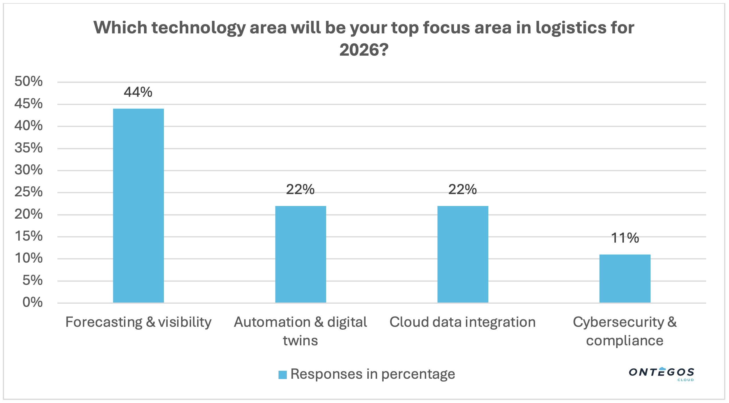 October 27, 2025, Germany: A new global survey by OntegosCloud reveals a striking insight into the digital priorities shaping logistics in 2026: while predictive visibility and forecasting have emerged as the top focus area globally, cybersecurity and compliance rank lowest, with just 11% of professionals naming it as their main technology priority.